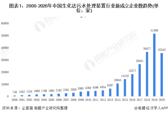 根據企查貓的數據顯示,2000-2020國生化法污水處理裝置行業新成立企業數呈現逐年上升趨勢。自2014年起,中國生化法污水處理裝置行業新成立企業數呈現爆發狀態,在2019到了近年了峰值51396家,較2013年的6397家翻了將近5倍。截止到2020年12月初,中國生化法污水處理裝置行業新成立企業數為35543家,已經逼近2018年全年的數據。