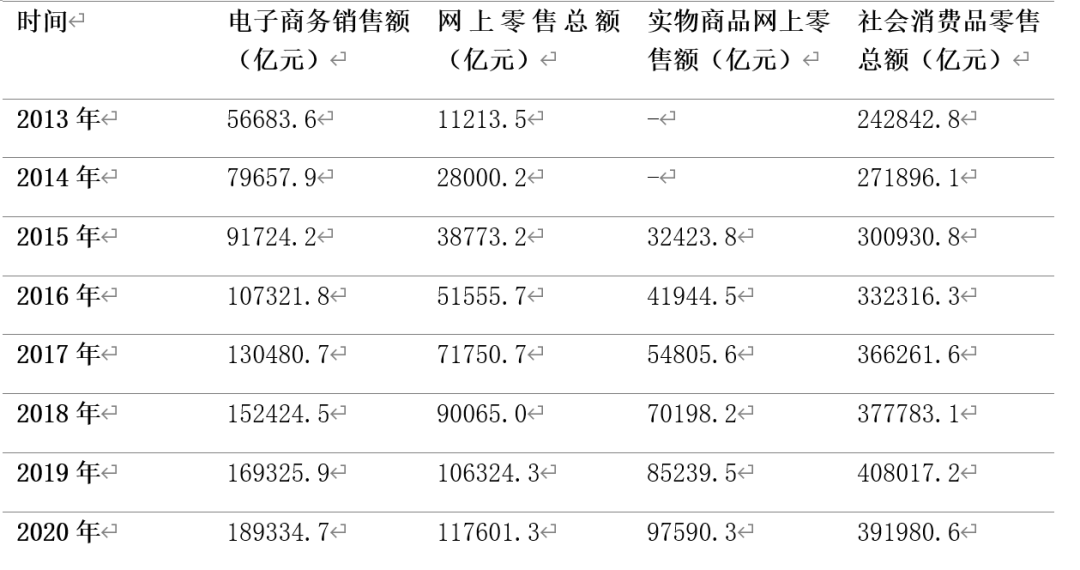 近年來我國互聯(lián)網(wǎng)產(chǎn)業(yè)呈現(xiàn)高速發(fā)展態(tài)勢,網(wǎng)民數(shù)量與互聯(lián)網(wǎng)普及率不斷增長,為網(wǎng)絡(luò)購物奠定了龐大的用戶基礎(chǔ)。數(shù)據(jù)顯示,截至2020年3月,我國網(wǎng)民規(guī)模達9.04億人,互聯(lián)網(wǎng)普及率為64.5%,較2018年底提升4.9個百分點。與此同時,電子商務市場規(guī)模也在不斷增長。2020年,電商領(lǐng)域總就業(yè)人數(shù)達到6015萬,較2019年增長約17.35%,預計到2025年將達到7000萬人。此外,2021年上半年,我國電商用戶達8.12 億,較2020年12月增長2965萬。2020年網(wǎng)上零售額為11.76萬億元,是2013年的10.5倍,占社會消費品零售額的比重由2013年的5%增長到2020年的30%。《2021年中國電商年度發(fā)展報告》顯示,今年前三季度我國網(wǎng)上零售額達9.19萬億元,同比增長18.5%。