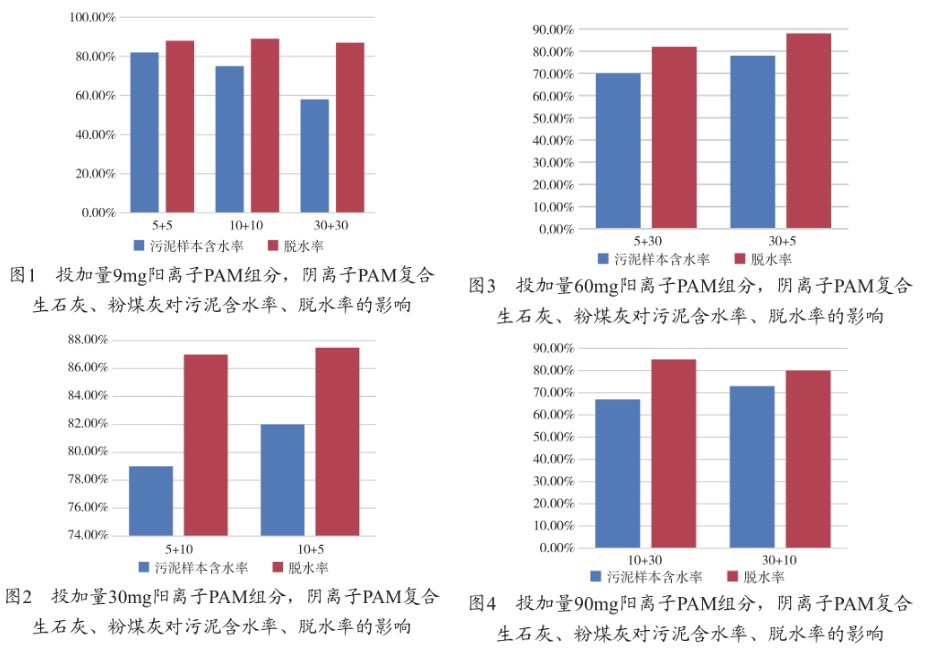 如圖1、圖2、圖3、圖4所示,分別為投加量為9mg、30mg、60mg、90mg的陽離子pam組分,陽離子pam 復(fù)合生石灰、粉煤灰對污泥含水率、脫水率的影響。