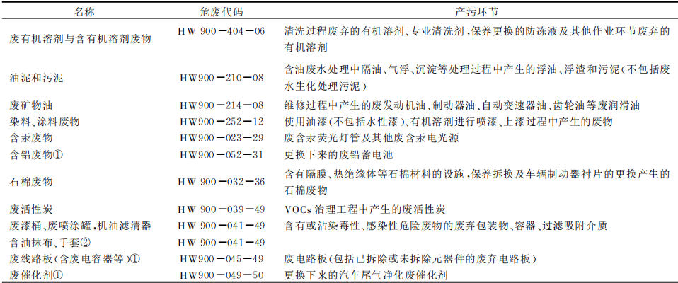 汽車維修過程產生的固體廢物包括一般工業固廢、危險固廢和生活垃圾三類。一般工業固廢有碎玻璃、廢塑料、廢輪胎、廢鋰電池等,對照《國家危險廢物名錄(2021年版)》,危險廢物共涉及8類12種(表1),其中廢礦物油、廢鉛蓄電池約占危險廢物總量的90%。