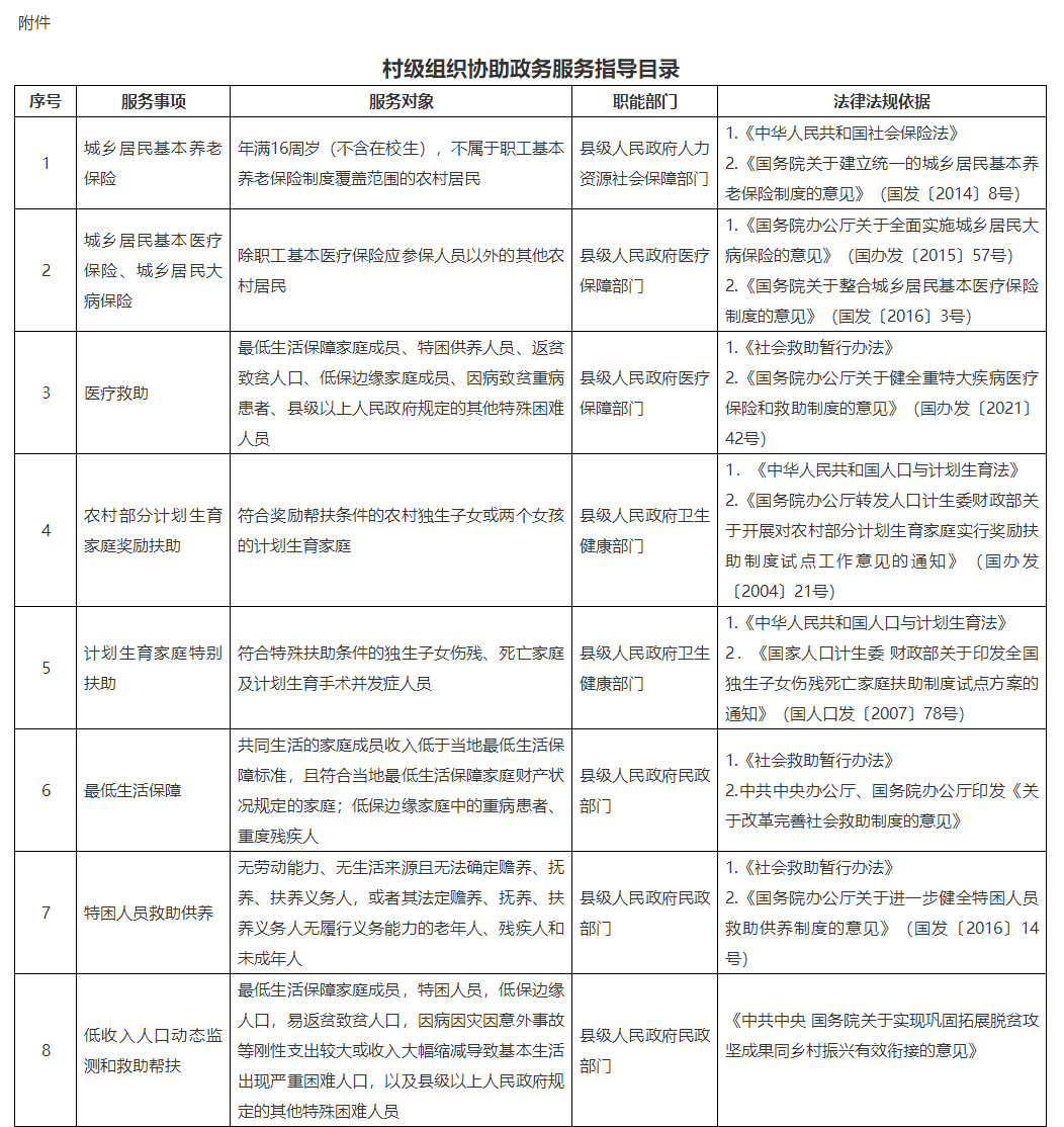 (一)依法協(xié)助辦理政務(wù)服務(wù)。指導(dǎo)村級(jí)組織根據(jù)協(xié)助政務(wù)服務(wù)目錄,結(jié)合實(shí)際細(xì)化辦理程序和辦法并公開(kāi),做好政務(wù)政策法規(guī)宣傳、信息發(fā)布、咨詢反饋等工作。協(xié)助落實(shí)重點(diǎn)群體走訪、監(jiān)測(cè)和救助幫扶等政策,做好基層治理數(shù)據(jù)采集校核工作。村委會(huì)要健全下屬公共衛(wèi)生委員會(huì),深入開(kāi)展愛(ài)國(guó)衛(wèi)生運(yùn)動(dòng),協(xié)助做好重大疫情及突發(fā)公共衛(wèi)生事件、計(jì)劃生育特殊家庭扶助關(guān)懷等工作;健全下屬治安保衛(wèi)委員會(huì)和人民調(diào)解委員會(huì),協(xié)助完善群防群治機(jī)制,加強(qiáng)民間糾紛排查調(diào)處;健全婦女和兒童工作委員會(huì),協(xié)助做好未成年人保護(hù)和困境兒童、留守婦女關(guān)愛(ài)服務(wù),落實(shí)家暴性侵等違法犯罪行為發(fā)現(xiàn)報(bào)告和家庭監(jiān)護(hù)監(jiān)督制度。