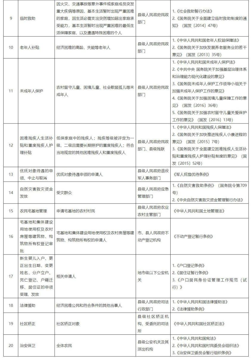 (九)警務(wù)和法律服務(wù)。做實(shí)農(nóng)村警務(wù)工作,健全完善聯(lián)防聯(lián)治機(jī)制。推動(dòng)普法宣傳、人民調(diào)解、法律援助等服務(wù)全覆蓋,充分發(fā)揮村法律顧問(wèn)作用。強(qiáng)化對(duì)社區(qū)矯正、社區(qū)戒毒社區(qū)康復(fù)、刑滿釋放人員幫扶救助和精神障礙社區(qū)康復(fù)服務(wù)。