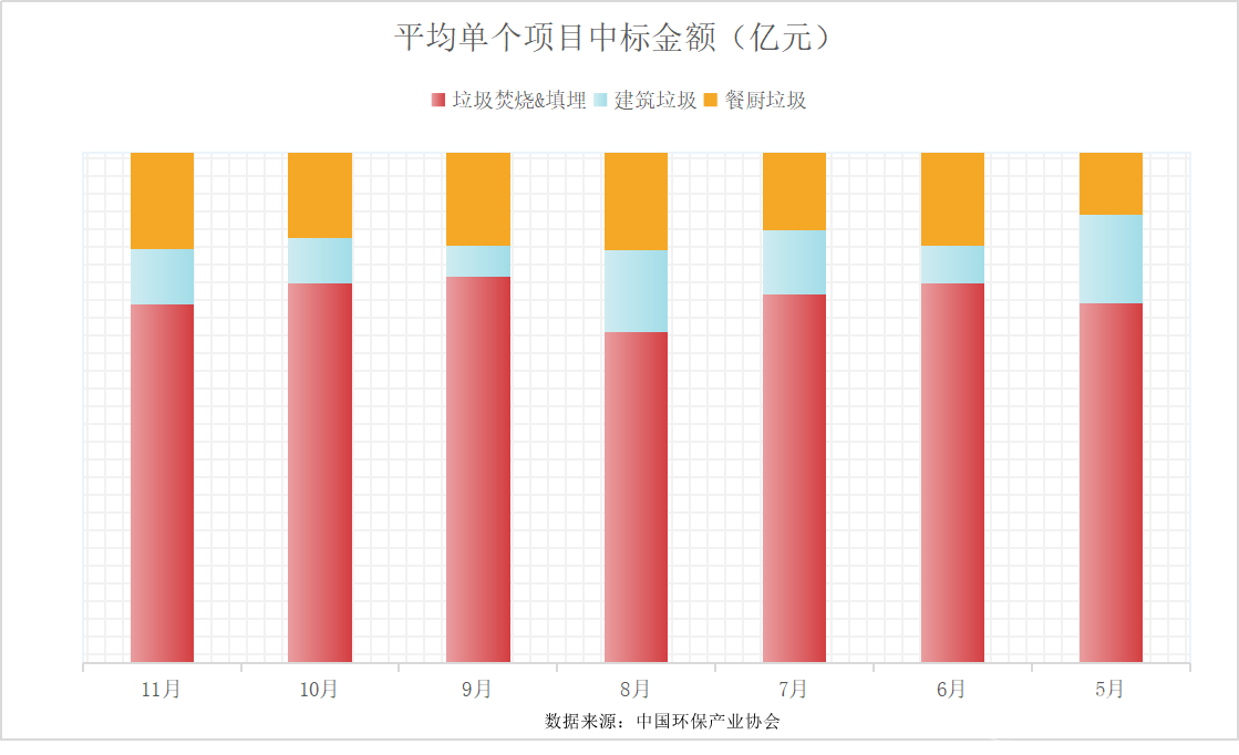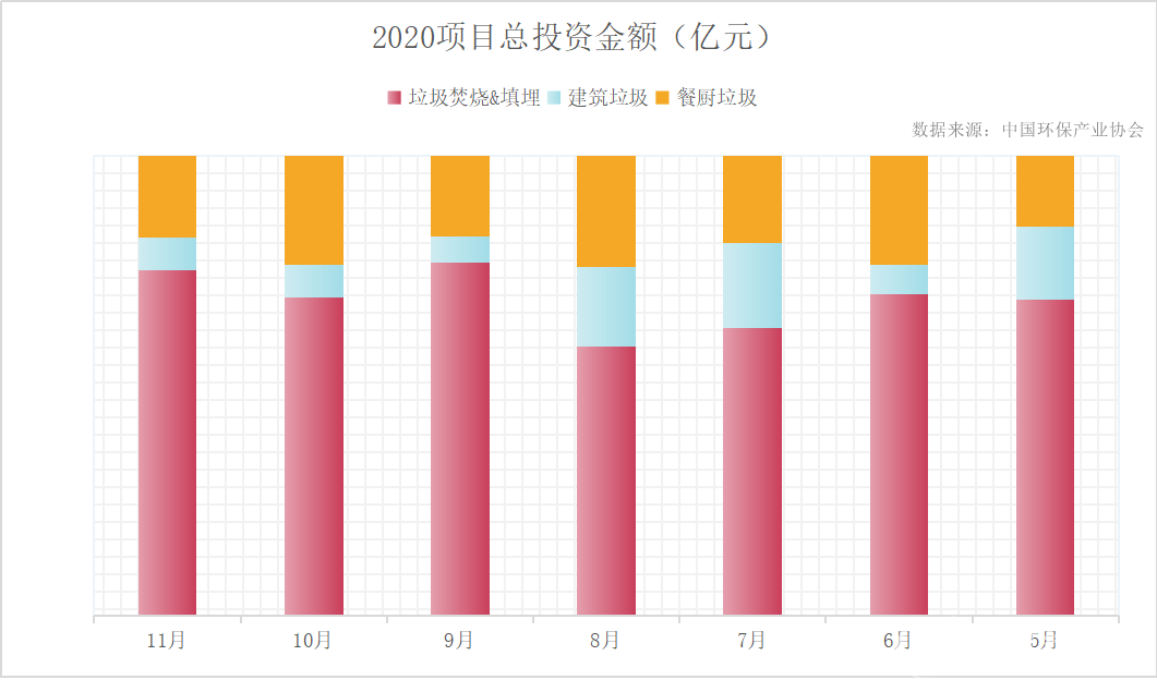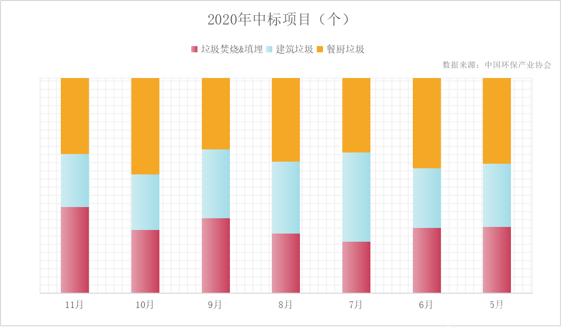 2020年前11個(gè)月,全國(guó)垃圾焚燒中標(biāo)項(xiàng)目共計(jì)311項(xiàng),總投資金額共計(jì)655.15億元;餐廚垃圾處理處置中標(biāo)項(xiàng)目共計(jì)361項(xiàng),總投資金額194.6億元;2020年5月到11月,全國(guó)建筑垃圾處理處置中標(biāo)項(xiàng)目共計(jì)213項(xiàng),總投資金額61.85億元。